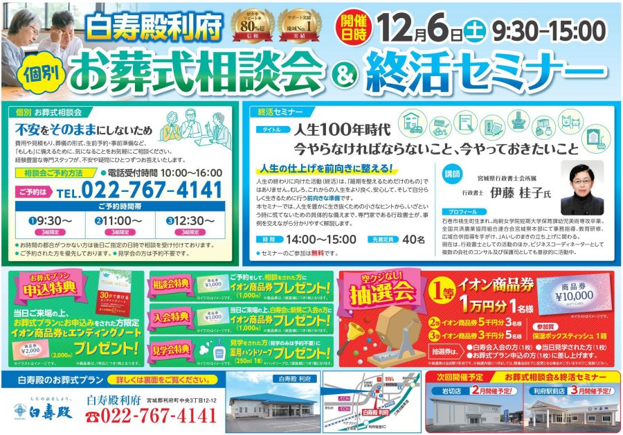 12月6日(土) AM9:30より「白寿殿利府 個別お葬式相談会&終活セミナー」+「抽選会」を開催いたします。事前予約受付中 お電話での事前予約がおすすめです。お電話 022-767-4141チラシダウンロードはこちらから